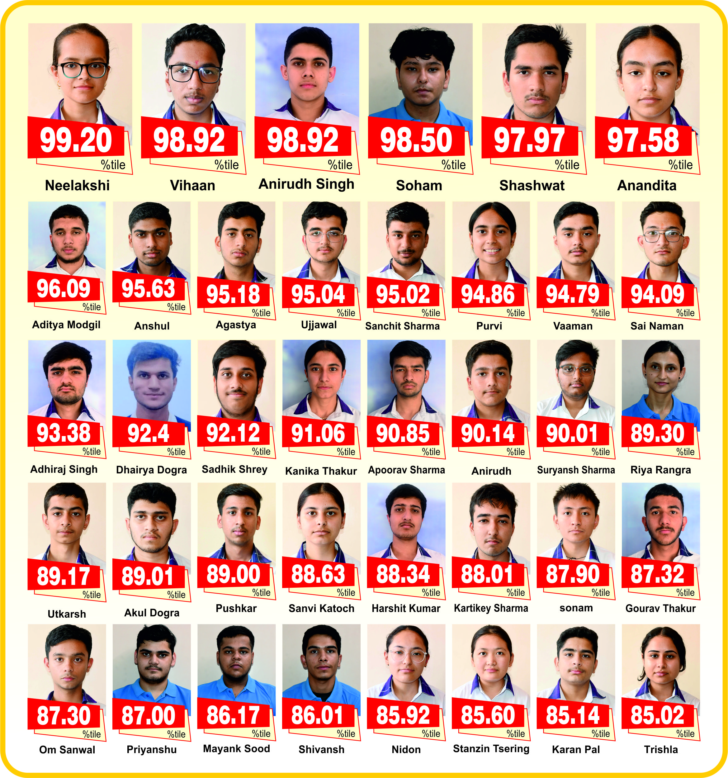किया। उनके पश्चात विहान बंसल (98.92), अनिरुद्ध सिंह पठानिया (98.92), सोहम शर्मा (98.50), शाश्वत शर्मा