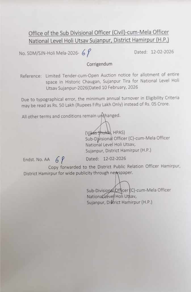सुजानपुर । राष्ट्र स्तरीय होली उत्सव सुजानपुर-2026 के लिए होने वाली चौगान की नीलामी में 50 लाख रुपये के वार्षिक टर्नओवर वाले व्यवसायी भी भाग ले सकते हैं। एसडीएम सुजानपुर एवं होली मेला अधिकारी विकास शुक्ला ने बताया कि चौगान की नीलामी के संबंध में 10 फरवरी को आमंत्रित टेंडर में नीलामी की पात्रता की […]